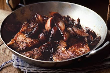 Steak & sticky red wine shallots