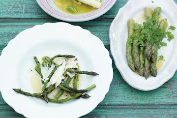 - Heat a large griddle pan and dry-griddle the asparagus spears on both sides until nicely marked. As soon as they're ready, put them on to four plates and dress with a good squeeze of lemon juice and three times as much olive oil.