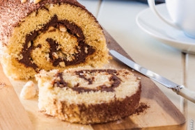 - Carefully unroll the cake and spread the Nutella over the cake, making sure to go right to the edges. Sprinkle with 2/3 of the chopped hazelnuts and carefully re-roll. Lightly dust with extra cocoa and serve.