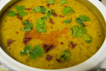- Mix the masala with the dal. Add the water and stir well. Add the coriander. Check for salt and adjust accordingly.